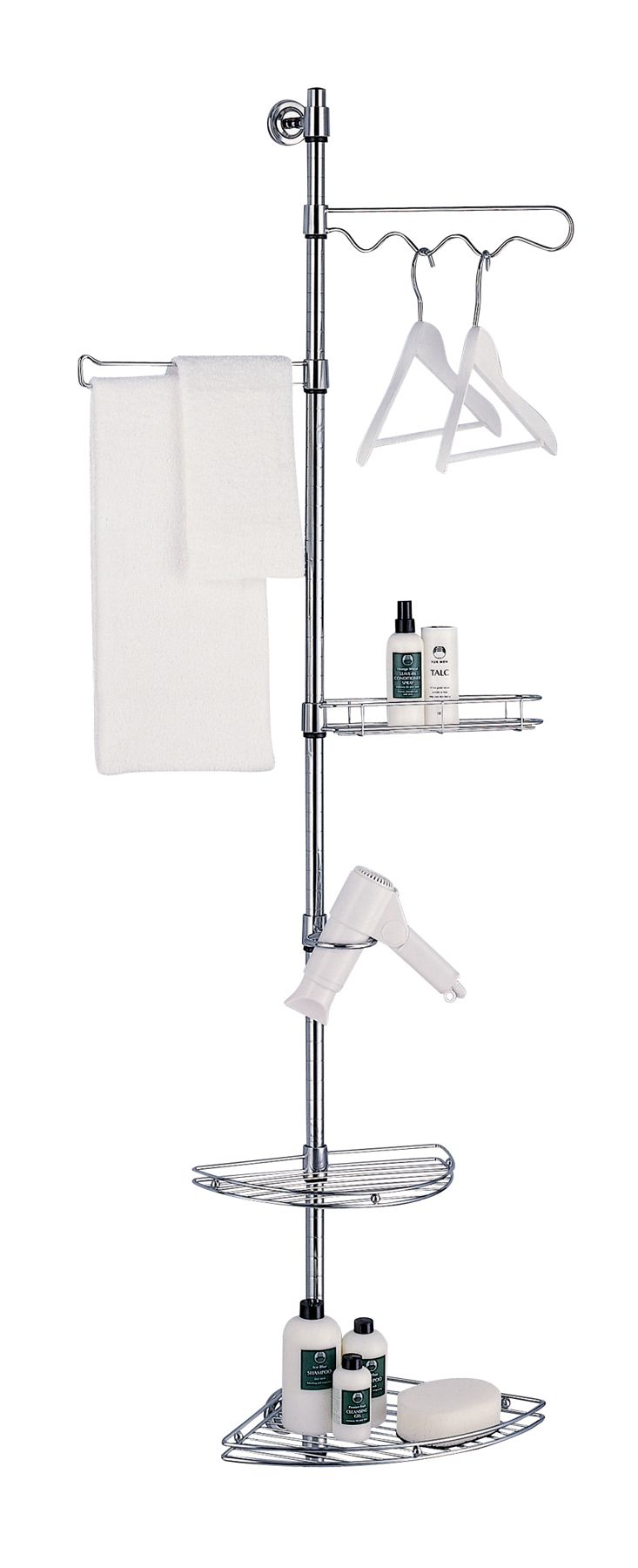 Constructed of tubular steel and metal wiring with a chrome finish, this valet is ideal for storing almost everything inside your bathroom from your hair-dryer to your lotion bottles, soap tray, towel bar, and you can hang your clothes on the top bar. Read more